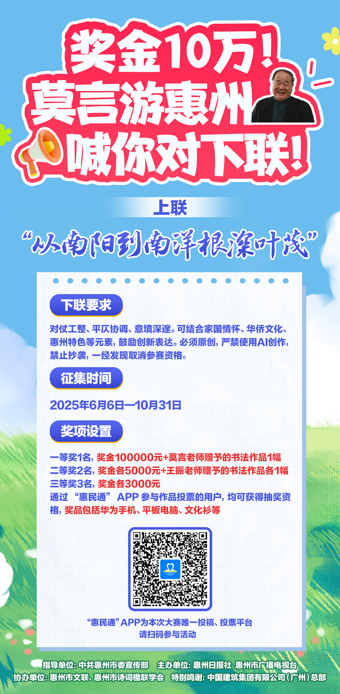 据悉,本次“对下联”活动将由惠州市诗词楹联学会专家评审团筛选出50件优秀作品进入终评,主办方邀请莫言老师担任专家评审团团长,王振担任专家评审团秘书长。